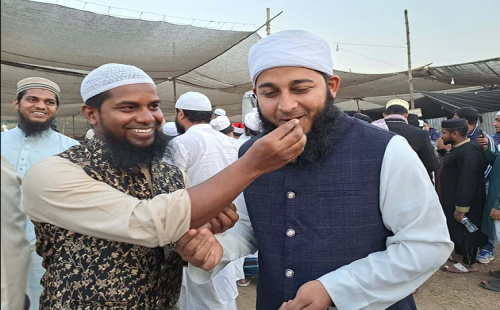 এ চিত্র শনিবার বিকেলের গাজীপুরের টঙ্গীর তুরাগতীরের ইজতেমা মাঠে। বিয়ে পড়ান ভারতের মাওলানা জুহাইরুল ইসলাম। পরে ইজতেমা মাঠে উপস্থিত হাজারো মুসল্লিকে নিয়ে দোয়া করা হয় সদ্য বিবাহিত বর ও কনের জন্য। বিতরণ করা হয় খেজুর।